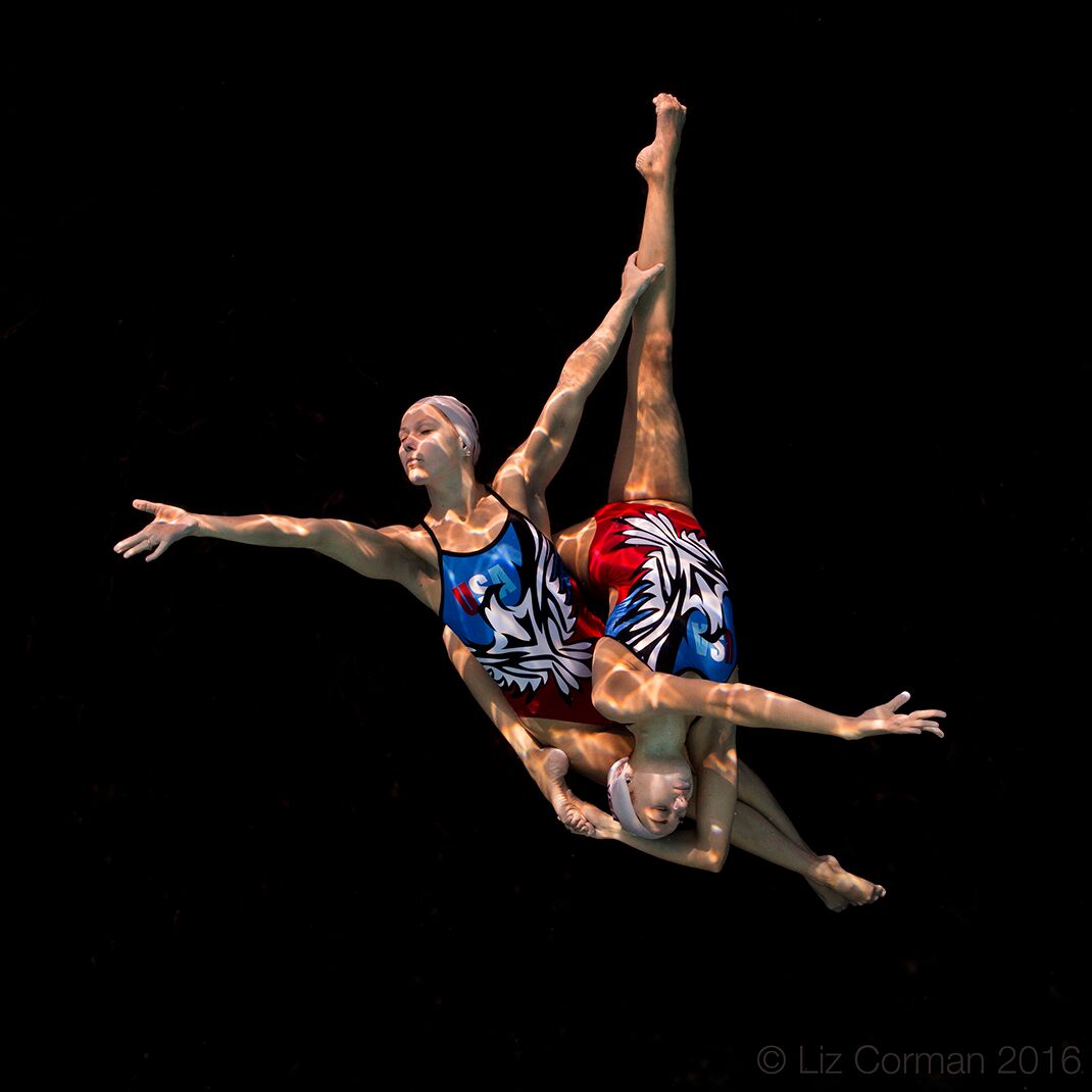 This photograph of former and current U.S. national team members Christina Jones, Kristina Lum-Underwood and Bill May, as if frozen in time and space, eerily floating in the dark, eyes closed, is one of Liz Corman’s most famous shots and part of a series that really marked her breakthrough on the artistic swimming photography scene.